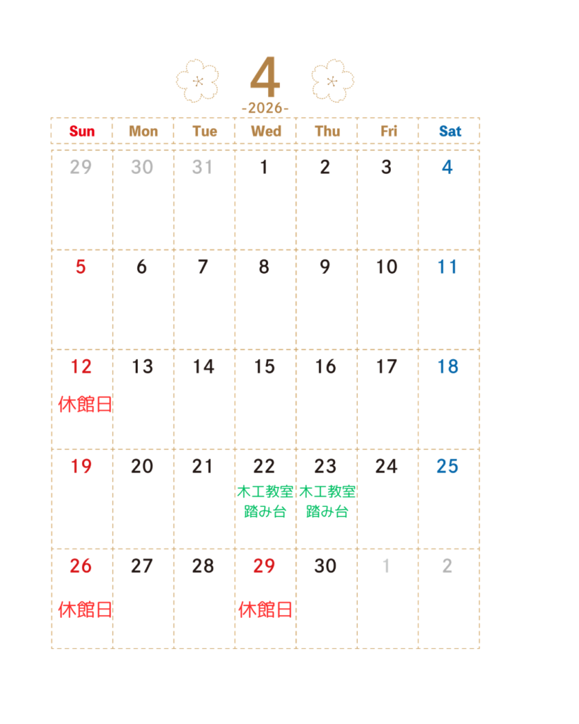 2026.04.01 4月休館日・行事予定表 春のあたたかさを感じる季節になりましたね。 4月も、ものづくりを楽しめる時間をお届けしていきます。 🍀4/22(水)~木工教室(作品:踏み台) 🍀4/23(木)~木工教室(作品:踏み台) ※木工体験・機械利用をご希望の場合は電話、メールでご予約をお願いします。 Post Share Hatena Pocket RSS feedly Pin it 3月休館日・行事予定表