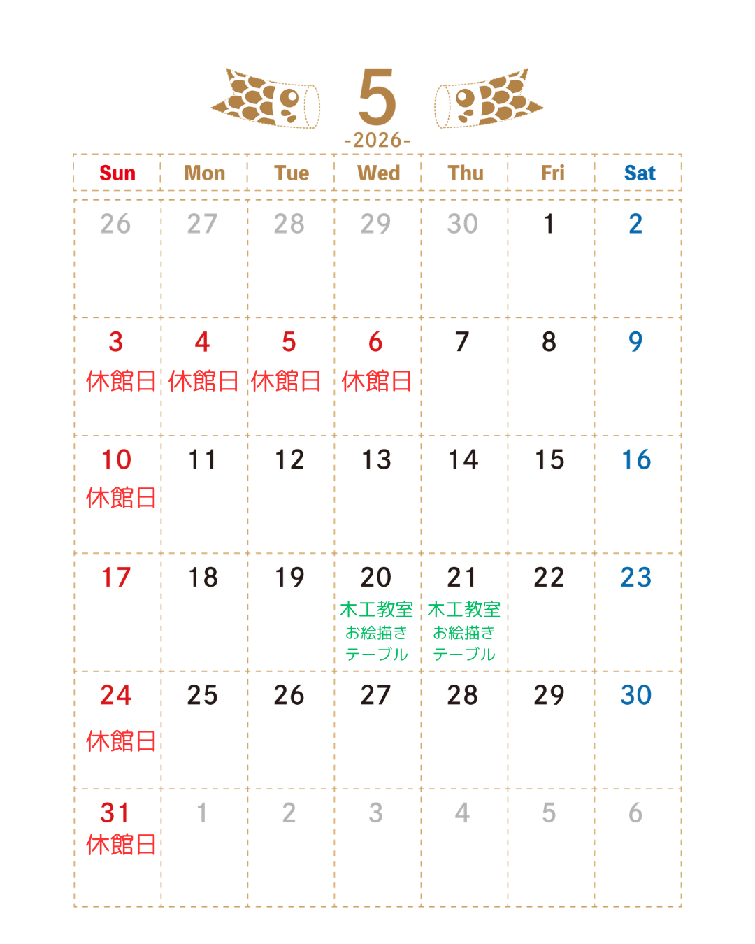 2026.05.01 5月休館日・行事予定表 外出が楽しい季節になりましたね。 5月も、ものづくりを楽しめる時間をお届けしていきます。 🍀5/20(水)~木工教室(作品:お絵描きテーブル) 🍀5/21(木)~木工教室(作品:お絵描きテーブル) ※木工体験・機械利用をご希望の場合は電話、メールでご予約をお願いします Post Share Hatena Pocket RSS feedly Pin it ゴールデンウイーク休館日